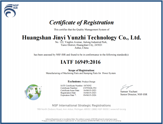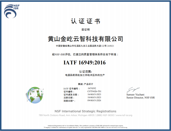 黃山金屹云智近期獲得了IATF 16949證書,這是對我司在汽車供應鏈質量管理方面的認可和肯定,也是我司在汽車產業可持續發展方面邁出的重要一步。