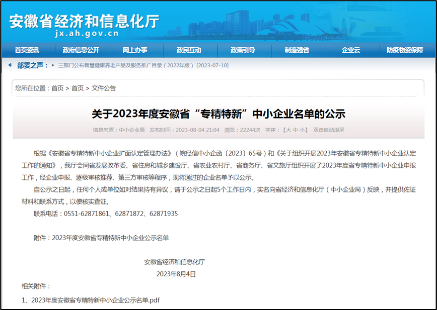 2023年8月4日,安徽省經濟和信息化廳公布2023年度省專精特新中小企業名單。金屹集團旗下的安徽金屹能源發展有限公司和黃山金屹云智科技有限公司均成功通過認證。