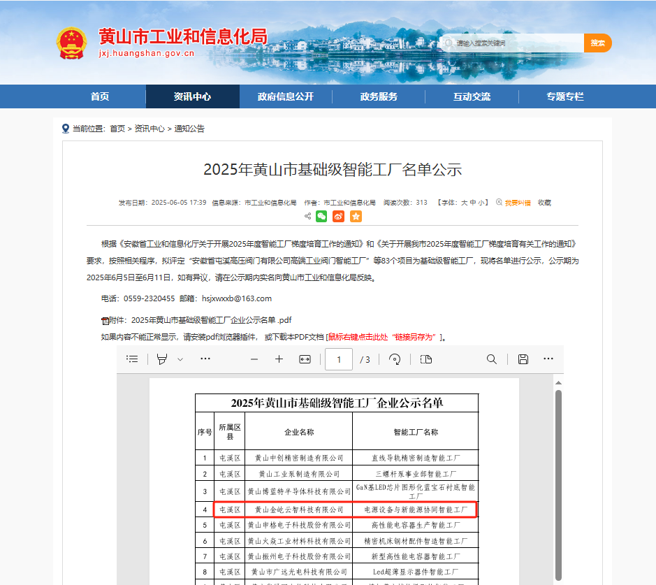 熱烈祝賀!黃山金屹云智科技有限公司榮登黃山市基礎級智能工廠榜單